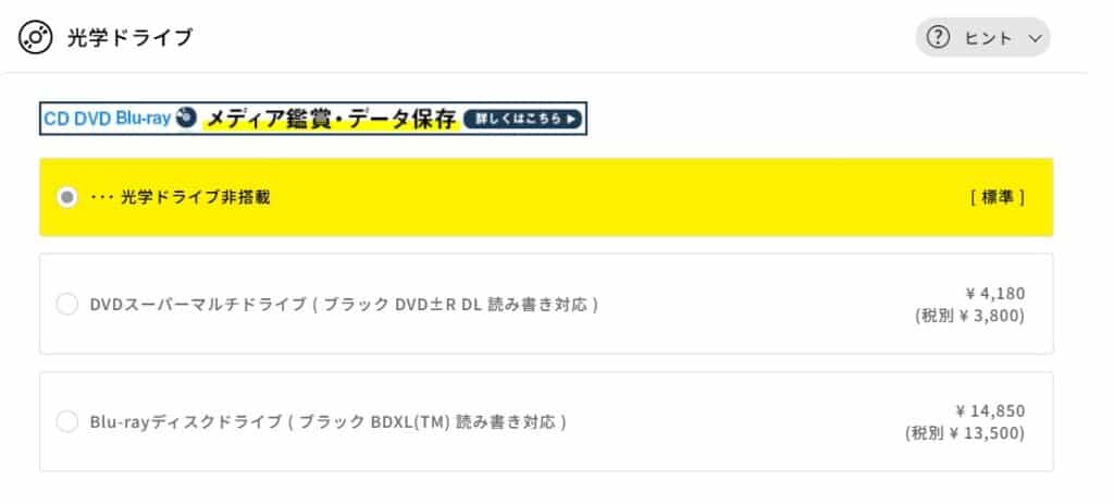 【光学ドライブ】ディスク不要なら「非搭載」でOK