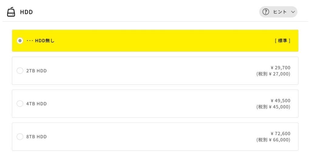 標準では「HDD無し」です。ゲームのプレイ用途だけならSSDで十分ですが、動画や写真、配信のアーカイブなど大容量データを保存したい方にはHDDの追加が向いています。SSDに比べて読み書き速度は遅いものの、容量あたりの価格が安いのが魅力です。配信や動画編集をする方は4TB(49,500円)がコスパに優れています。