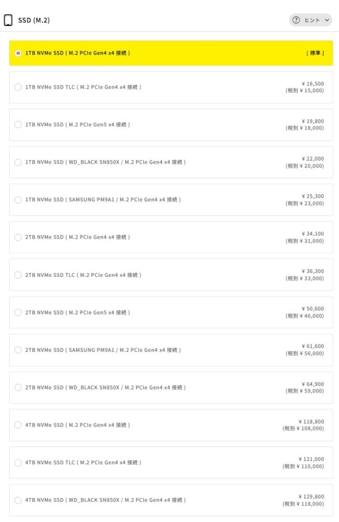標準の1TBでもOSやゲーム数本は入りますが、最近の大型ゲームは1本で100GB以上になることも珍しくなく、すぐに容量が不足しがちです。予算に余裕があれば2TB NVMe SSD(34,100円〜)への変更をおすすめします。