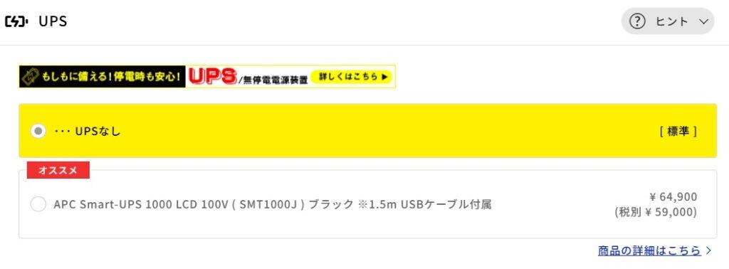 ただし、落雷や停電が多い地域にお住まいの方や、作業中のデータ消失を確実に防ぎたい方には有効です。ゲーム用途であれば「UPSなし」のままで問題ありません。必要と感じた場合はあとから市販のUPSを別途購入することもできます。