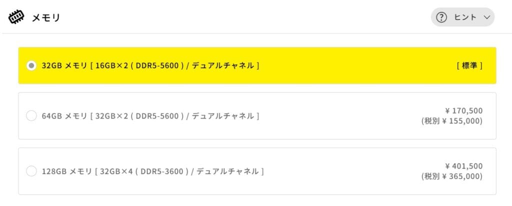 標準の32GB(16GB×2)は、ゲームプレイはもちろん、配信やブラウザの同時利用でも快適に動作する十分な容量です。64GB(170,500円)や128GB(401,500円)への増設も選べますが、いずれもかなり高額です。