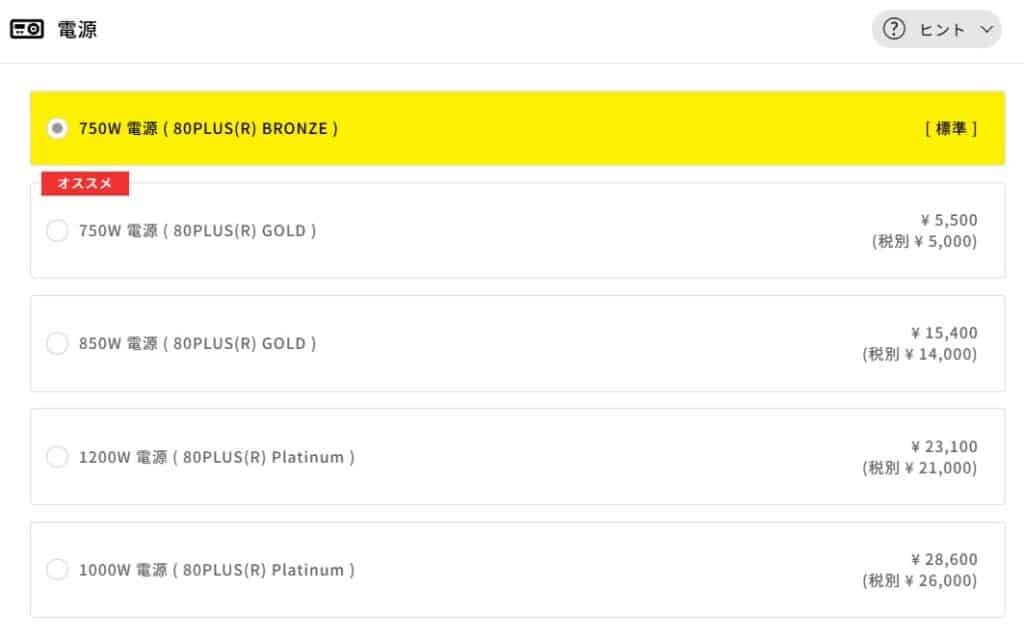 +5,500円と手頃な追加費用で長期的にメリットがあるため、コスパの高いカスタマイズといえます。将来的にパーツの増設やグラフィックボードの交換を考えている方は、余裕を持って850W GOLD(15,400円)を選んでおくと安心です。