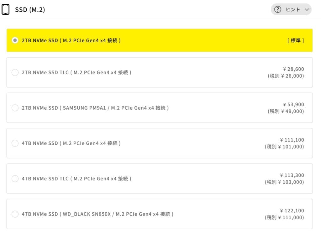 大量のゲームに加えて動画素材や配信データも保存したい方は4TB(111,100円〜)への変更を検討してもよいでしょう。ただし、追加費用が高額なため、M.2スロットに空きが1つあることを活かして、後から自分でSSDを増設する方がコストを抑えられます。まずは標準構成で使い始めるのがおすすめです。