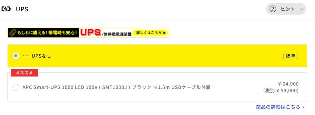 ただし、ゲーム用途がメインの方にとっては優先度が低く、64,900円と高額なため無理に追加する必要はありません。落雷による停電が多い地域にお住まいの方や、仕事の大切なデータも扱う方は検討する価値がありますが、ほとんどの方は「UPSなし」のままで問題ないでしょう。
