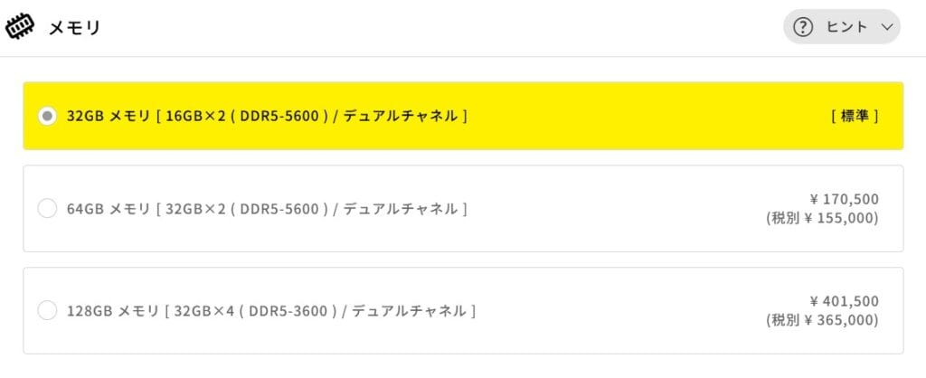 メモリ標準容量32GB(16GB×2 / デュアルチャネル)