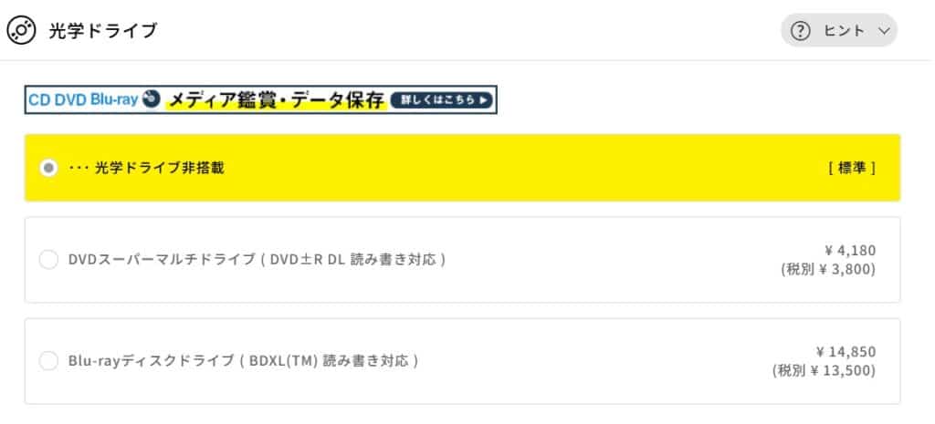 DVDやCDの読み書きが必要な方はDVDスーパーマルチドライブ(4,180円)を、Blu-rayディスクの再生や書き込みも行いたい方はBlu-rayドライブ(14,850円)を選びましょう。なお、使用頻度が低い方は市販のUSB接続タイプの外付けドライブを必要なときだけ使う方法もあります。