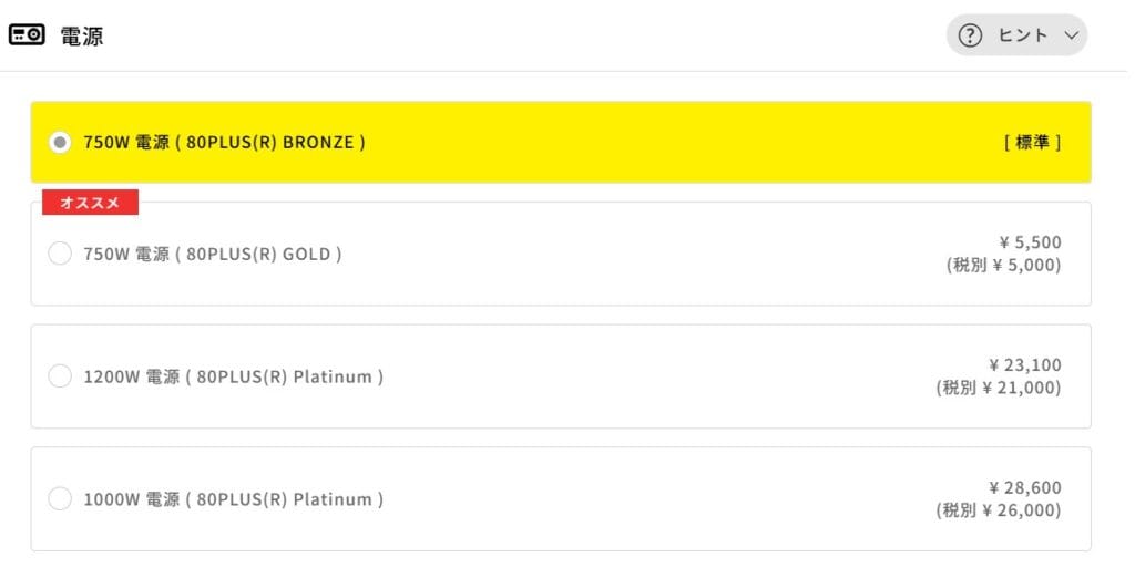 ただし、余裕を持ちたい方や電気代を少しでも抑えたい方は、変換効率の高い750W GOLD(5,500円)へのアップグレードがコスパの良い選択です。将来的にグラフィックボードをさらに上位のモデルに換装する可能性がある方は、1000Wや1200WのPlatinum電源を選んでおくと安心ですが、現状の構成では標準のままで不足はありません。