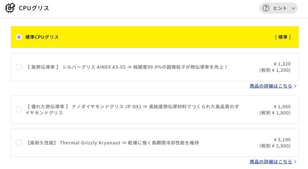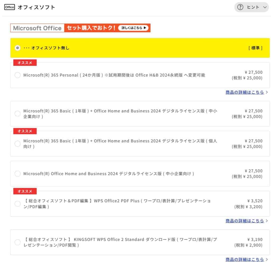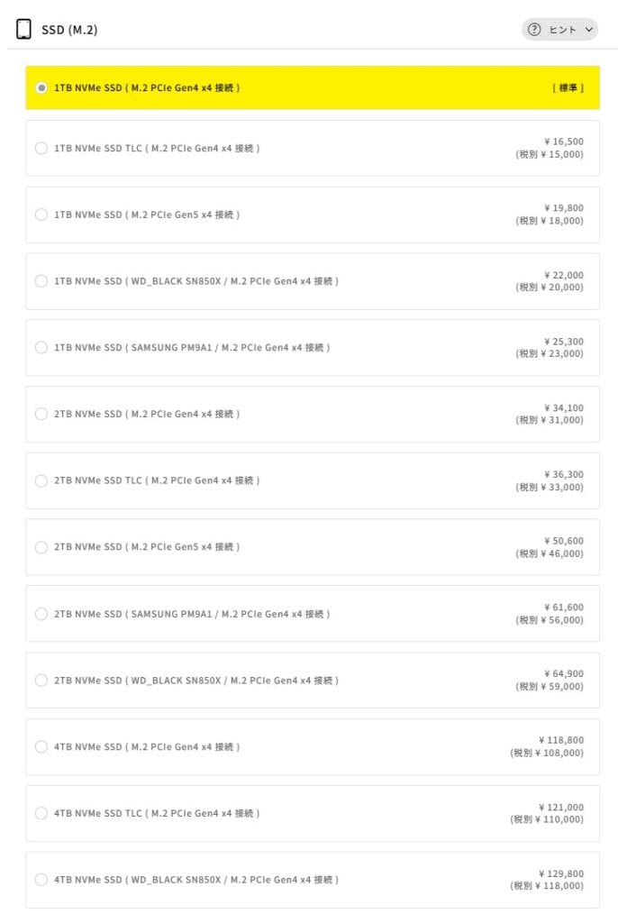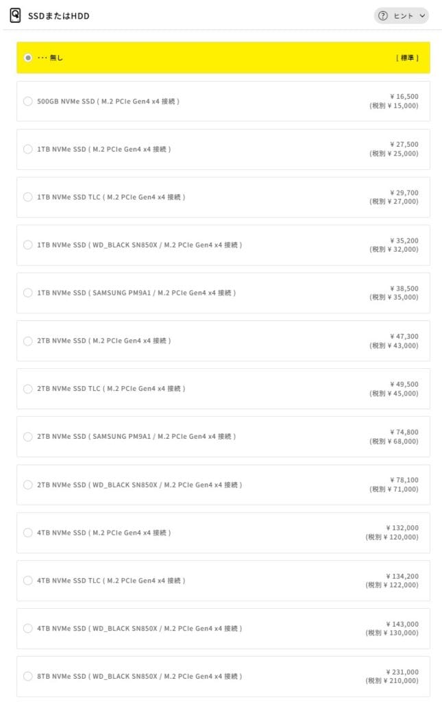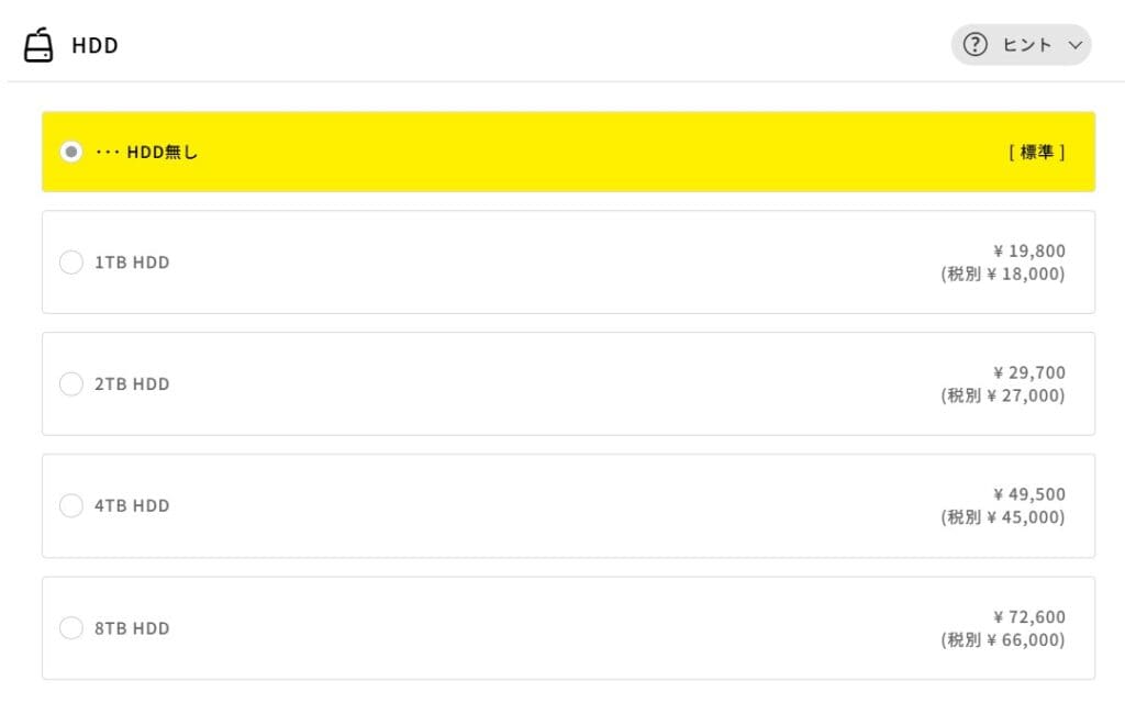 大容量のデータ保存が目的であっても、SSDの方が快適に使えるため、ストレージを増やしたい場合は前述のSSDオプションで対応するのがおすすめです。HDDは市販品でも安価に入手できるので、どうしても大容量の保存領域が必要になったときに後から自分で追加する方が賢い選択です。