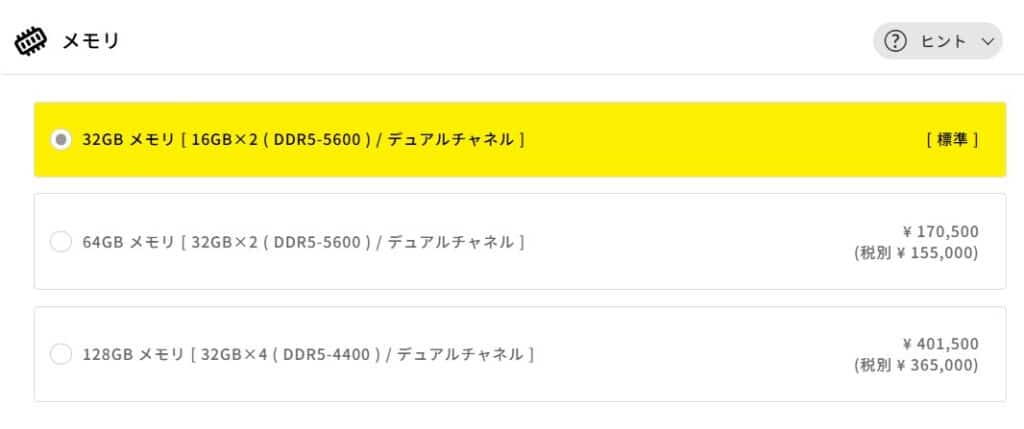 メモリ標準容量32GB(16GB×2 / デュアルチャネル)