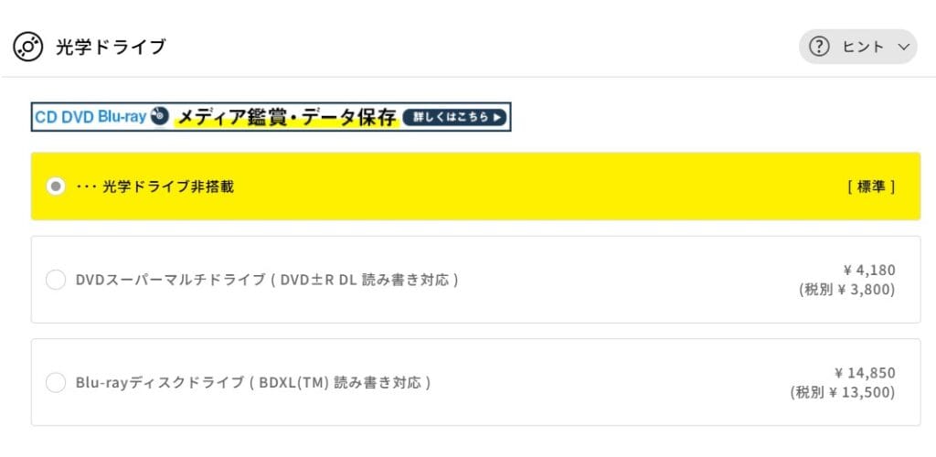 必要になったときにUSB接続の外付けドライブを購入するという方法もあるので、迷ったら非搭載のままで大丈夫です。