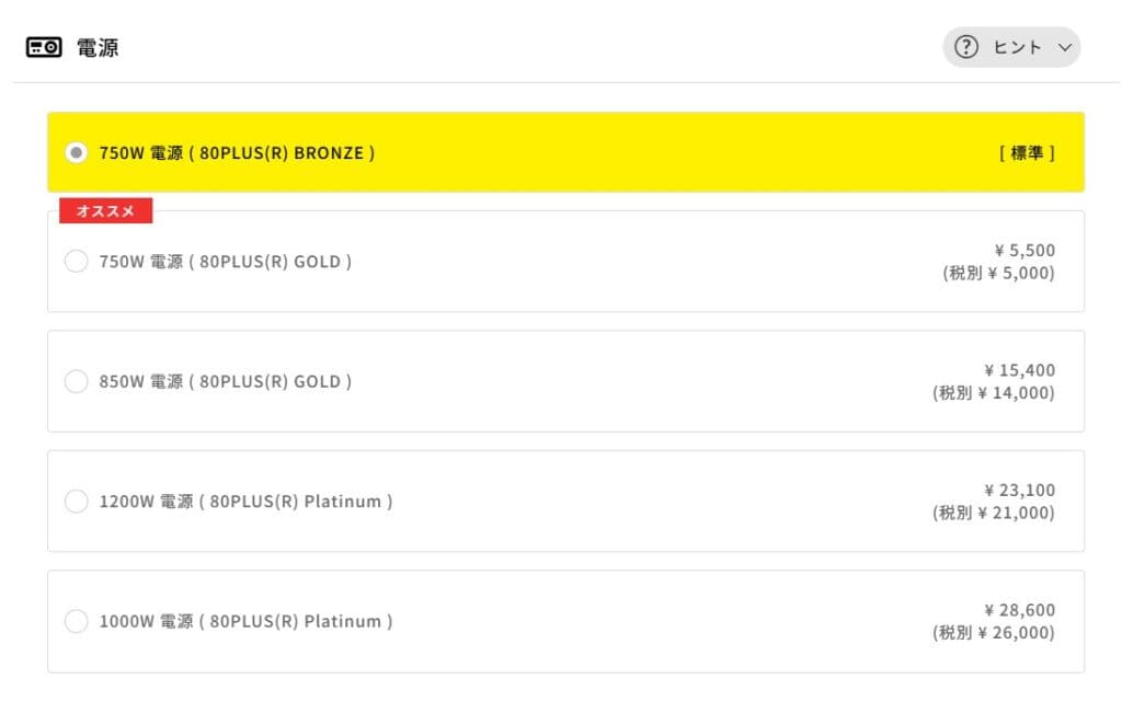ただし、+5,500円で選べる750W GOLDへの変更はコスパに優れたおすすめカスタマイズです。GOLD認証はBRONZEより電力変換効率が高く、電気代の節約や発熱の低減につながります。