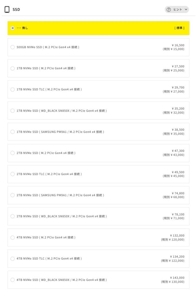 これは1台目とは別に、2台目のSSDを追加するかどうかの項目です。標準の「無し」のままでも問題ありません。1台目のSSDの容量を2TBにしていれば、当面は不足しにくいでしょう。
