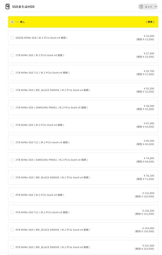 こちらは3台目のストレージを追加するかどうかの項目です。ゲーム用途がメインであれば、1台目のSSD容量を十分に確保しておけば追加する必要はありません。