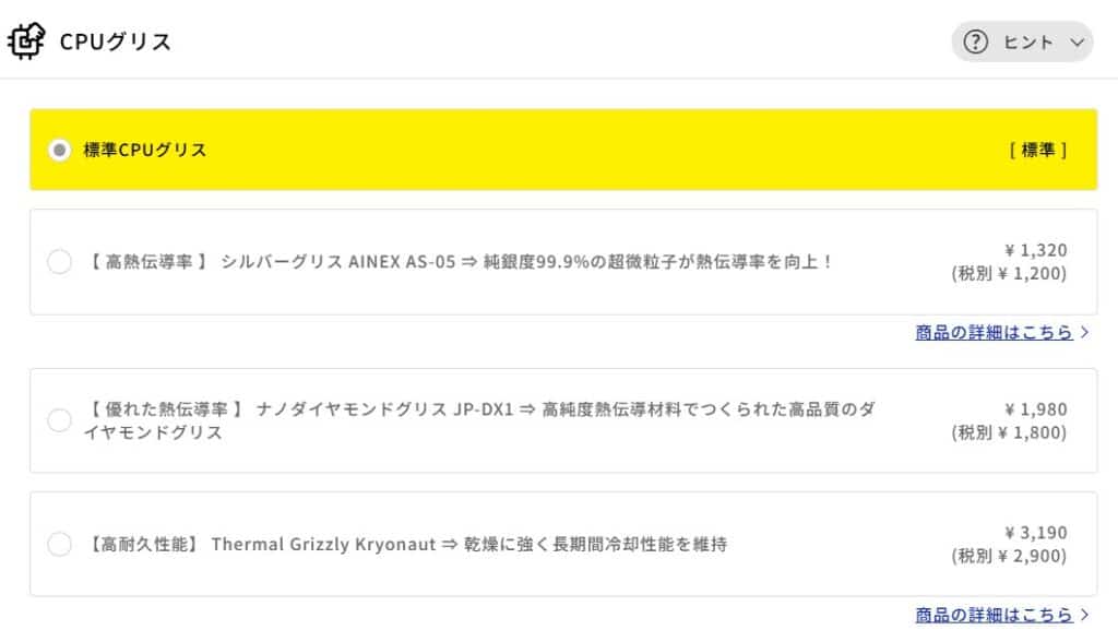 特にThermal Grizzly Kryonaut(¥3,190)は乾燥しにくく長期間にわたって冷却性能を維持できるため、何年も安定して使い続けたい方に向いています。