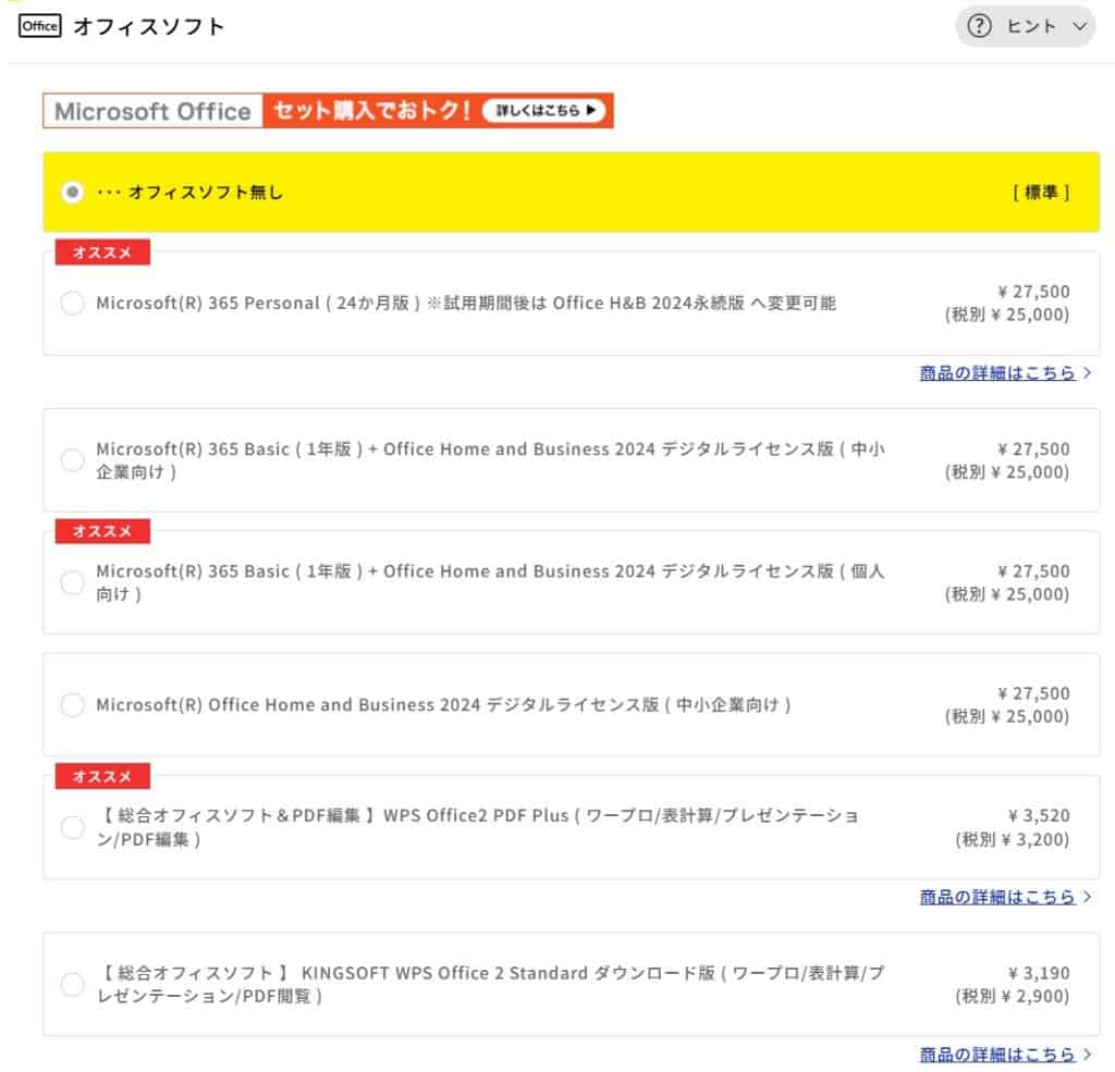 たまに簡単な文書作成をする程度であれば、¥3,520のWPS Office2 PDF Plusがコストを抑えられる選択肢です。Googleドキュメントなど無料ツールで十分という方は「無し」のままで問題ありません。