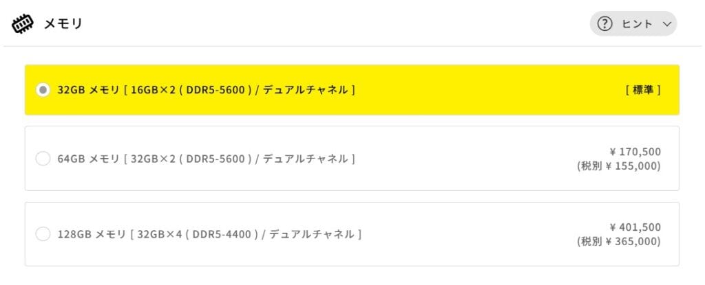 64GB(¥170,500)や128GB(¥401,500)への増設は追加費用が非常に高額なため、3DCG制作や大規模なデータ処理など特殊な用途がない限りおすすめしません。