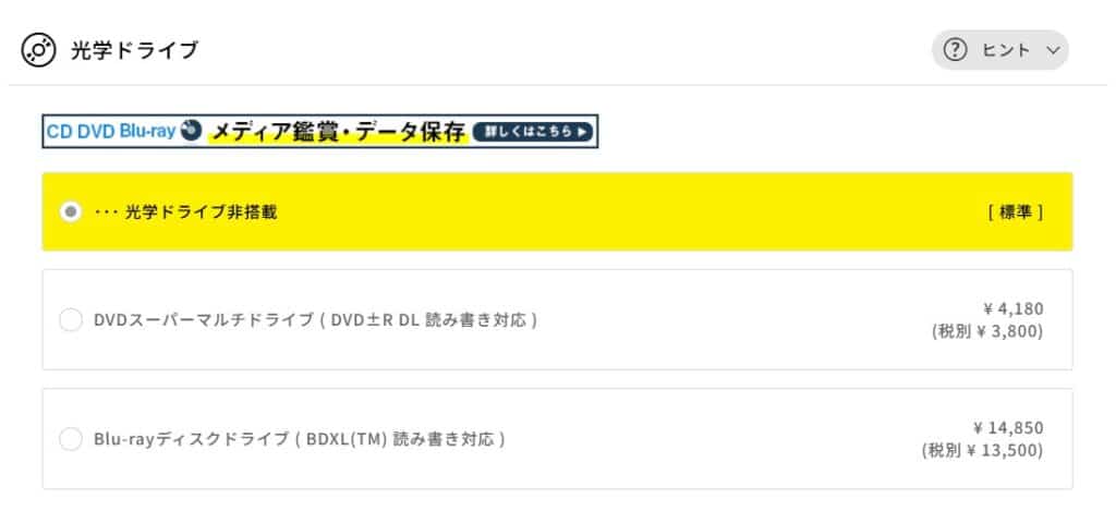 映画のブルーレイ鑑賞やCDの取り込みなど明確な用途がある方のみ検討しましょう。必要になった場合はUSB接続の外付けドライブが2,000〜3,000円程度で購入できるため、後からでも対応できます。