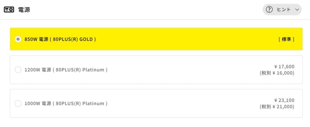 【電源】標準の850Wで十分