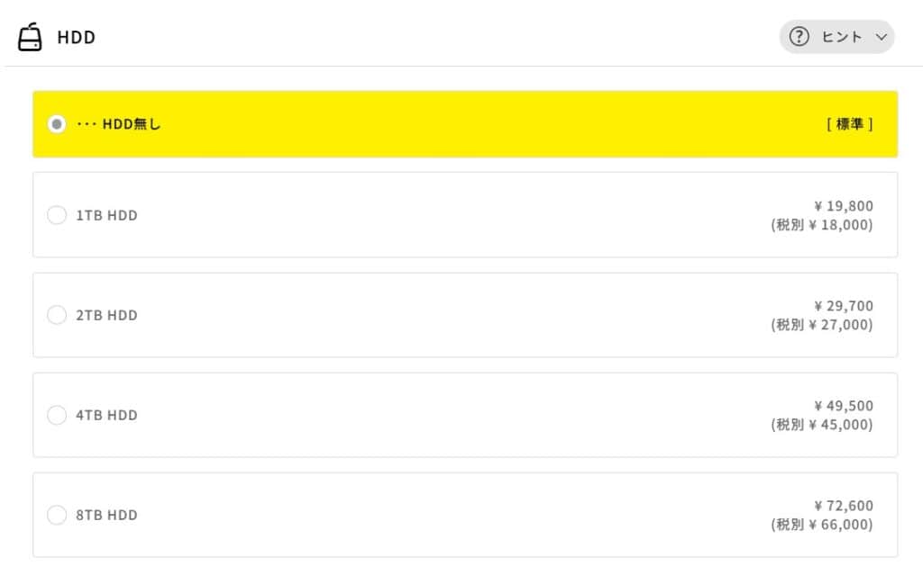 標準では「HDD無し」となっています。ゲームの起動やPCの動作速度にはSSDが重要なため、HDDが無くても快適さに影響はありません。