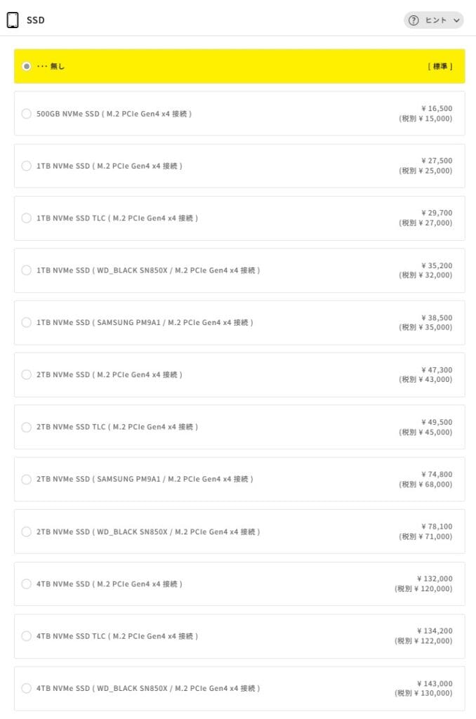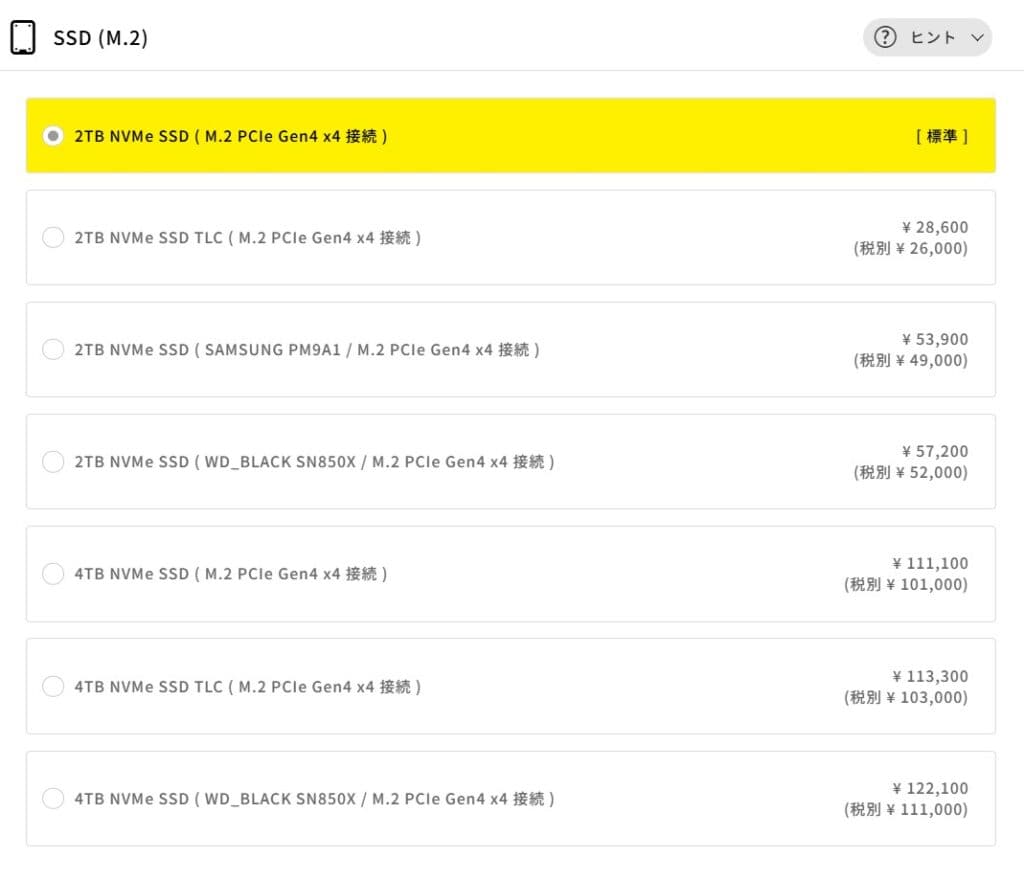 同じ2TBでもSAMSUNGやWD_BLACKなどのブランド品に変更可能ですが、体感できる速度差は小さいため、こだわりがなければ標準のままで問題ありません。