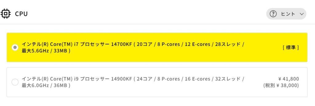 +41,800円でCore i9-14900KF(24コア32スレッド/最大6.0GHz)へのアップグレードも可能ですが、ゲーム用途ではi7との差はわずかです。