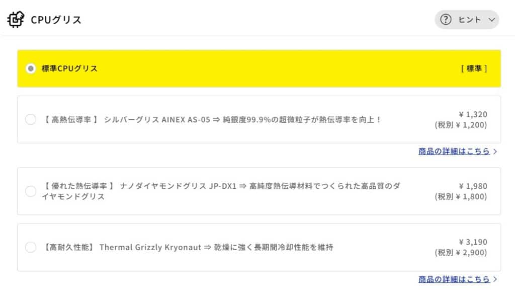 おすすめは「ナノダイヤモンドグリス JP-DX1」(+1,980円)で、コストと性能のバランスに優れています。長期間使い続けることを考えると、少額の投資でCPU温度を抑えられるため、予算に余裕があればカスタマイズしておきたい項目です。