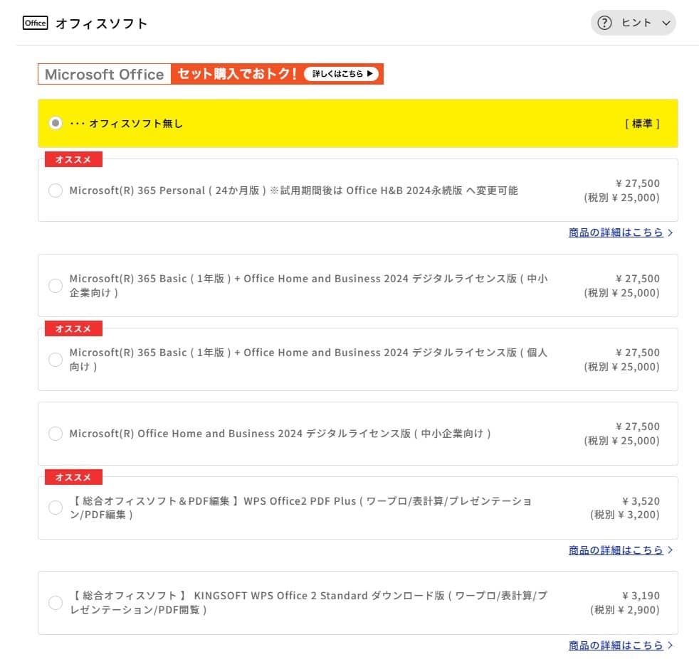 費用を抑えたい方には「WPS Office2 PDF Plus」(+3,520円)が手頃な選択肢です。Microsoft Officeとの互換性が高く、普段使いには十分対応できます。ゲーム専用機として使うならオフィスソフト無しのままでも問題ありません。