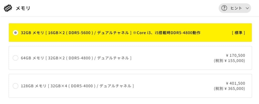 | メモリ標準容量 | 32GB(16GB×2 / デュアルチャネル) |