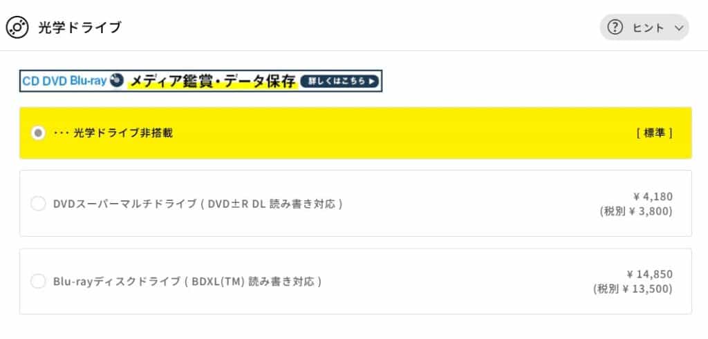 ただし、手持ちのDVDやBlu-rayで映画を観たい方や、CDから音楽を取り込みたい方は検討してもよいでしょう。DVDドライブ(+4,180円)は手頃な価格で追加できます。Blu-rayの視聴も必要な方にはBlu-rayドライブ(+14,850円)も用意されています。