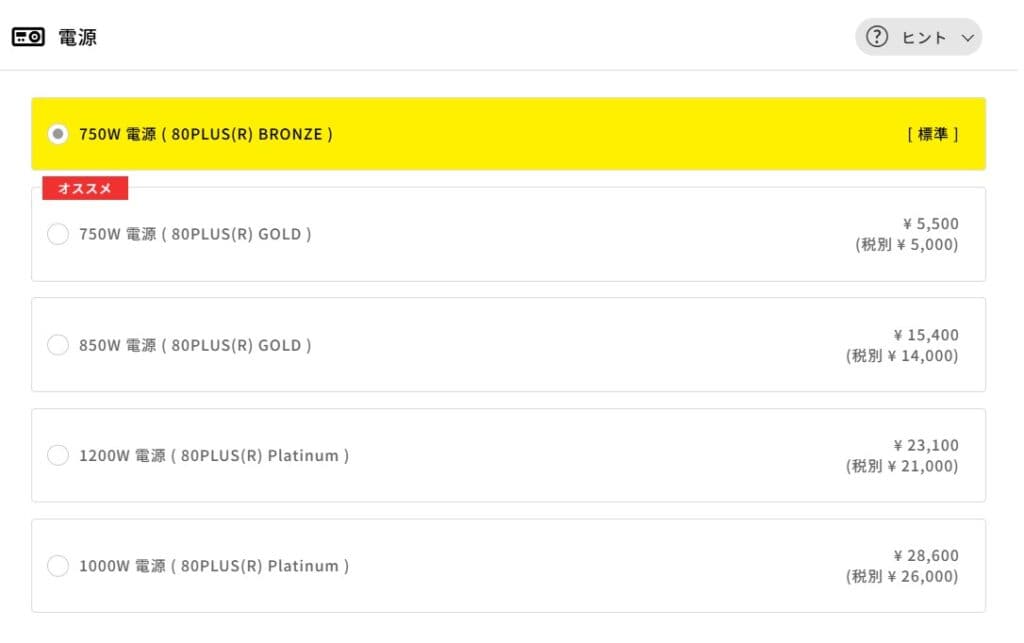 予算を抑えたい場合は「750W GOLD」(+5,500円)への変更だけでも、電源の品質と効率が向上するためおすすめです。