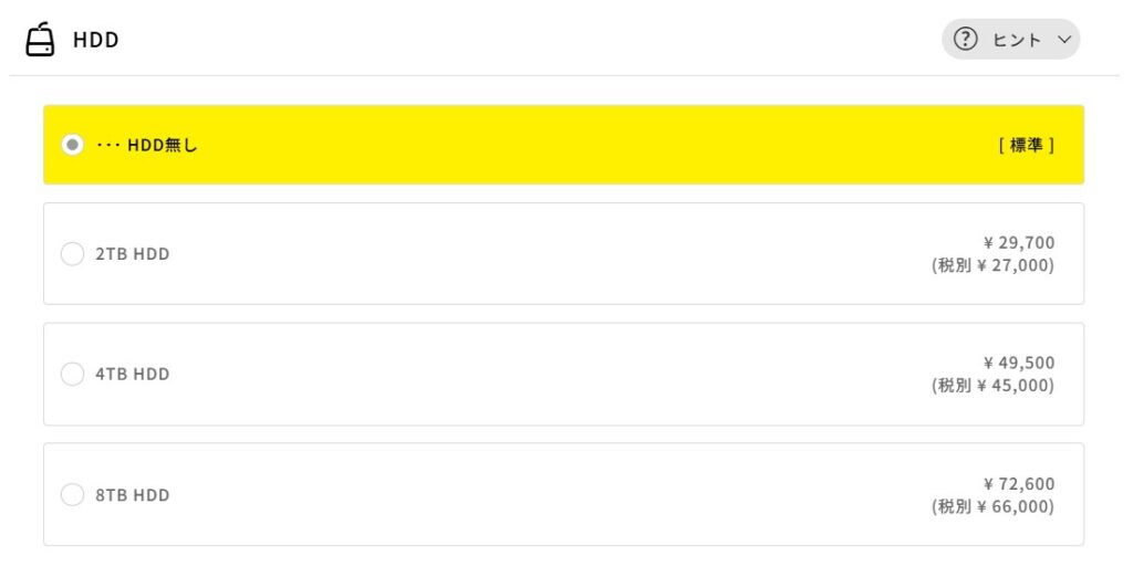 標準構成ではHDDは搭載されていません。SSDに比べて読み書き速度は遅いものの、大容量データを低コストで保存できるのがHDDの強みです。ゲーム配信の録画データや動画素材、写真など大容量ファイルをたくさん保管したい方は、4TB(49,500円)や8TB(72,600円)の追加を検討してもよいでしょう。
