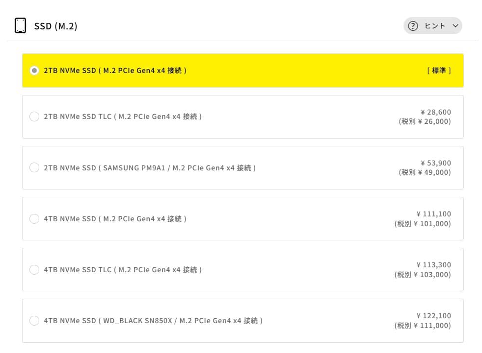 動画素材を大量に扱う方やゲームライブラリが膨大な方は4TB(111,100円〜)を検討してもよいでしょう。ただし、本機にはM.2スロットの空きが1つあるため、後からSSDを追加して保存先を分ける方法も有効です。まずは標準構成で始めて、容量不足を感じてから増設するのが賢い選択です。
