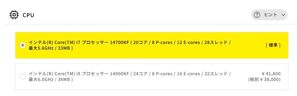 上位のCore i9-14900KF(24コア/32スレッド/最大6.0GHz)は+41,800円(税込)で選択可能ですが、ゲーム性能の差はわずかです。4K動画の大量エンコードや本格的な3DCG制作など、極めて重いマルチスレッド処理を日常的に行う方以外は、コストパフォーマンスに優れる標準のi7をおすすめします。