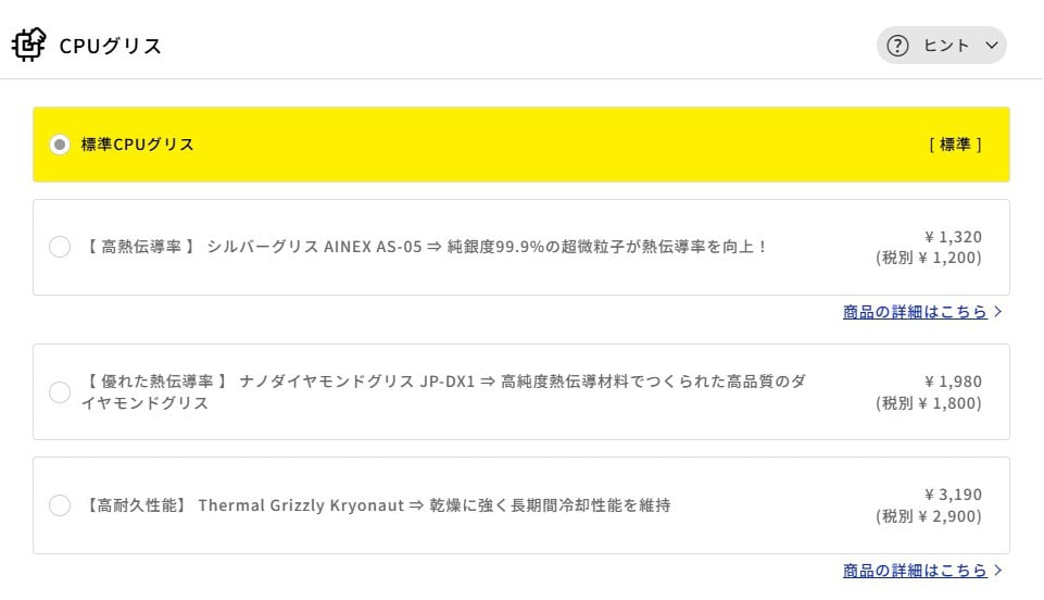 CPUグリスはCPUとクーラーの間に塗る熱伝導材で、冷却効率に直接影響します。標準グリスでも通常使用には問題ありませんが、少額の投資で冷却性能を底上げできるためコスパの良いカスタマイズです。