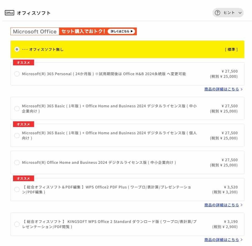 標準構成ではオフィスソフトは付属しません。ゲーム専用として使うなら追加不要ですが、WordやExcelも使いたい場合は同時購入がお得です。