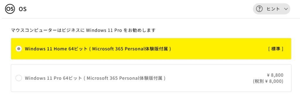 一方、Windows 11 Proは+8,800円(税込)で選択可能で、リモートデスクトップやBitLockerによるドライブ暗号化など、ビジネス向けの管理機能が追加されます。自宅でのゲームや趣味目的がメインであればHome版のまま、仕事でも本格的に使う予定がある方はPro版への変更を検討しましょう。