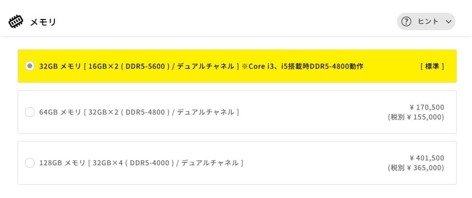 64GB(170,500円)や128GB(401,500円)への増設は価格が大幅に上がるうえ、一般的なゲーム用途では体感差がほぼありません。本格的な4K動画編集や大規模な3DCG制作を行う方のみ検討の余地がありますが、本機はメモリスロットに空きが2つあるため、必要になったら、後から増設する方法もおすすめです。