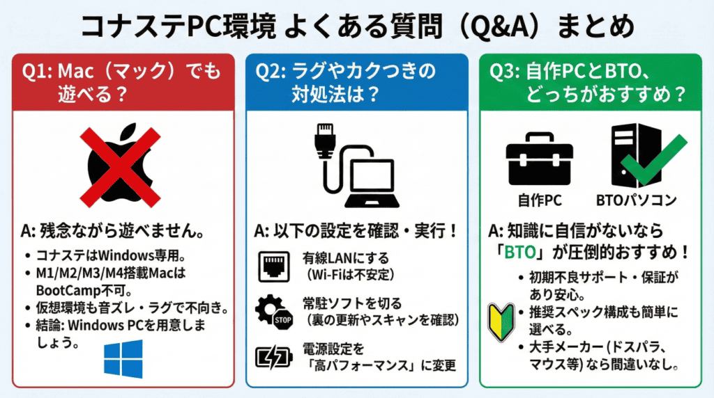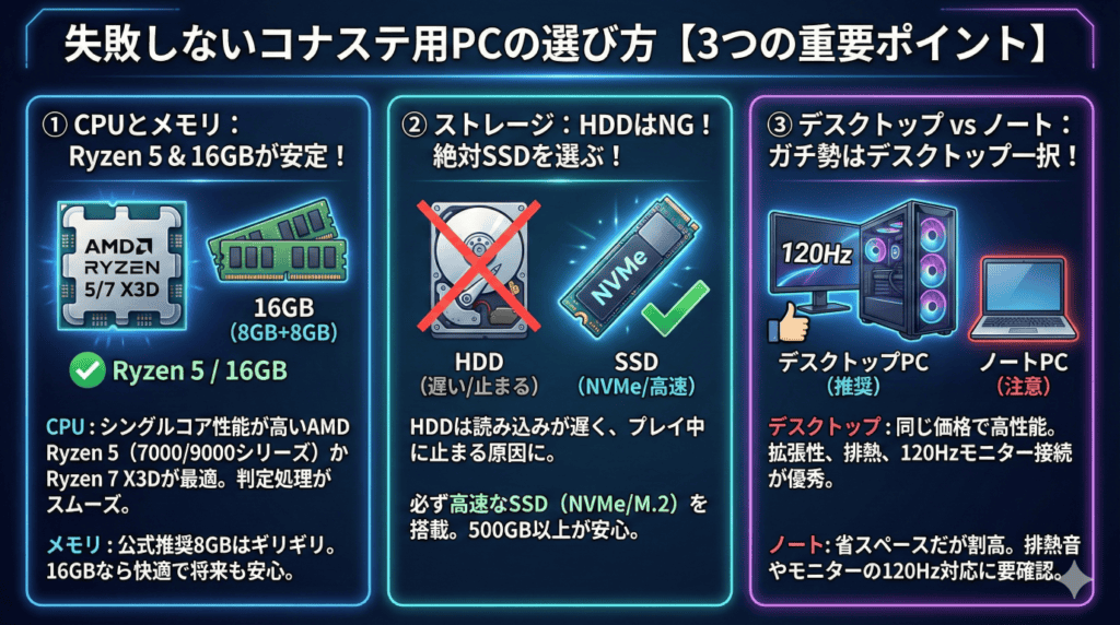 2026年、コナステを楽しむためのPC選びの結論は以下の通りです。