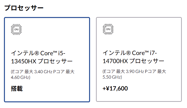 | プロセッサー | ・インテル Core i5-13450HX プロセッサー ・インテル Core i7-14700HX プロセッサー |