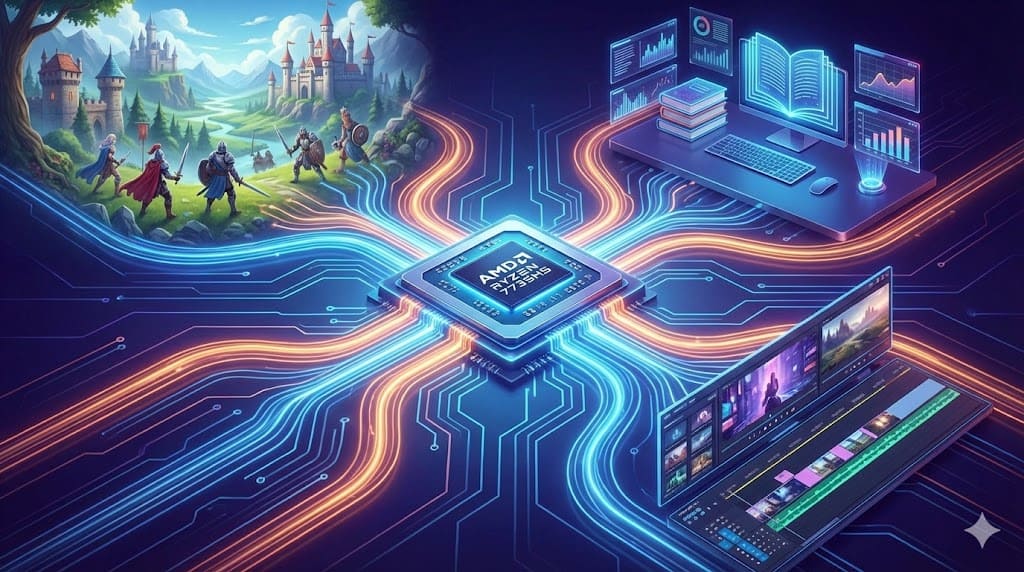 パソコンの頭脳であるCPUには、AMD製の高性能モデル「Ryzen 7 7735HS」を搭載しています。ゲームも勉強もサクサクこなす、その凄さを3つのポイントで紹介します。