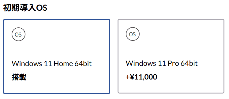 基本的に標準の「Windows 11 Home」のままで大丈夫です。ゲームや学校の宿題、ネットサーフィンなど、普段やりたいことはこれですべてできます。「Pro」は会社の仕事で特別な機能が必要な人向けなので、プラス11,000円払って変更する必要はほとんどありません。そのまま購入しましょう。