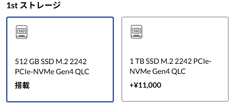 標準の「512GB」でも最初は足りますが、最近のゲームは容量が大きいので、いくつか入れるとすぐに一杯になります。長く使うなら、プラス11,000円で「1TB」に増やすのがおすすめです。容量を気にせず色々なゲームや動画を保存できるので、後から「足りない!」と困ることがなくなります。