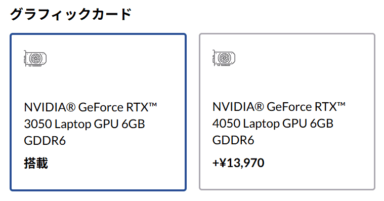 | グラフィックボード | NVIDIA GeForce RTX 4050 Laptop GPU NVIDIA GeForce RTX 3050 Laptop GPU |