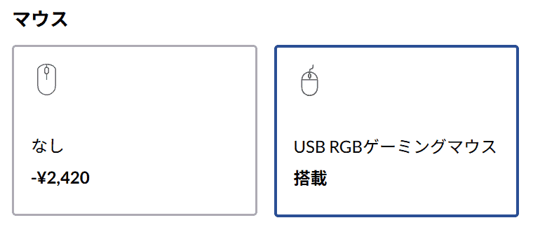 標準でマウスが付いていますが、もし自分のマウスを持っていたり、後で好きなものを買いたい場合は、「なし」を選んで約2,400円安くするのが賢い方法です。まだ持っていない人は、この価格で光るゲーミングマウスが手に入るので、そのまま購入してまずは使ってみるのもおすすめです。