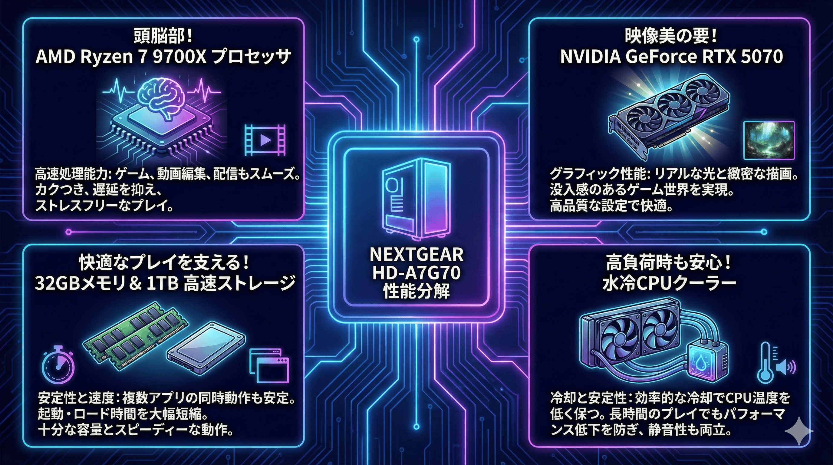 「NEXTGEAR HD-A7G70」の優れた評判の根幹にあるのは、その高い性能です。ここでは、ゲーム体験に直結する主要なパーツを一つずつ詳しく見ていきましょう。