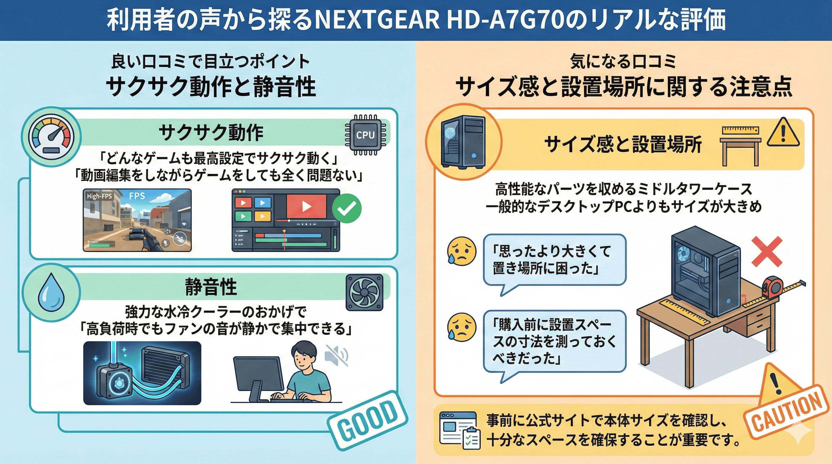 ここでは、実際に「NEXTGEAR HD-A7G70」の性能や仕様から想定される、利用者からのリアルな評判を良い点と気になる点に分けてご紹介します。