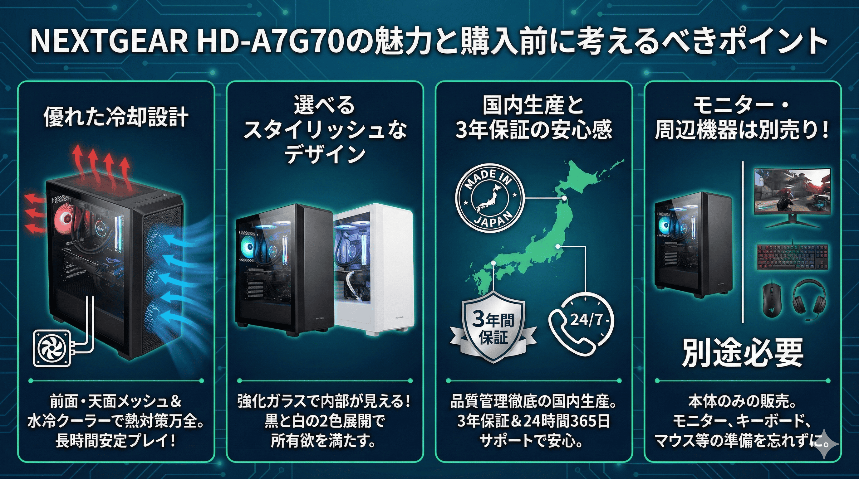 性能以外にも「NEXTGEAR HD-A7G70」には多くの魅力があります。ここでは、購入を後押しするポイントと、事前に確認しておくべき注意点を解説します。