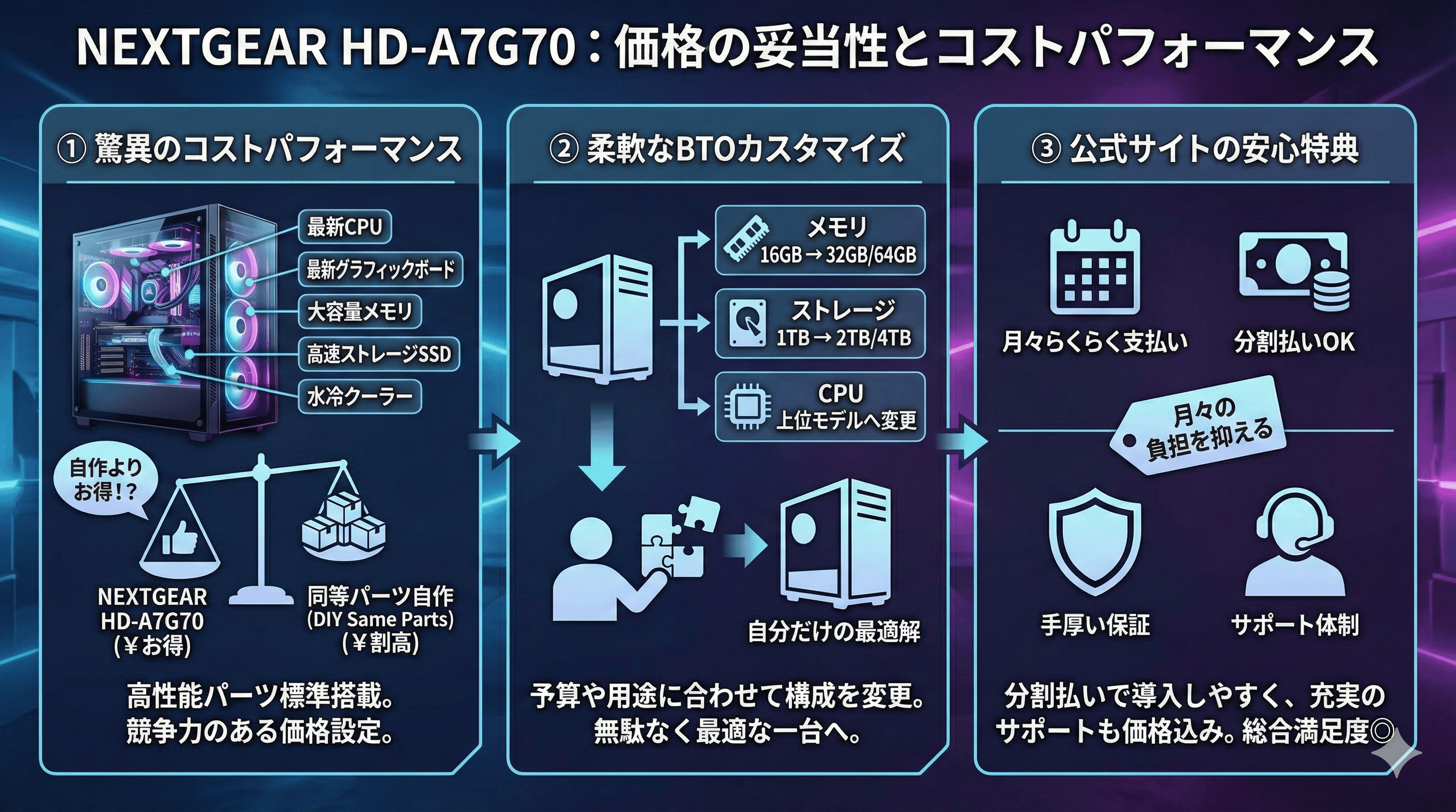 最後に、この記事で解説した「NEXTGEAR HD-A7G70」の評判とポイントをまとめます。