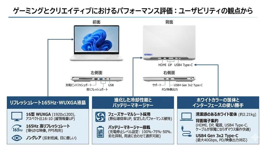 筐体は清潔感のあるホワイト一色で統一されており、デザイン性を重視するユーザーから高い評価が期待されます。本体重量は約2.21kg、厚さは26.5mmと、16型ゲーミングノートとしては標準的なサイズ感です。