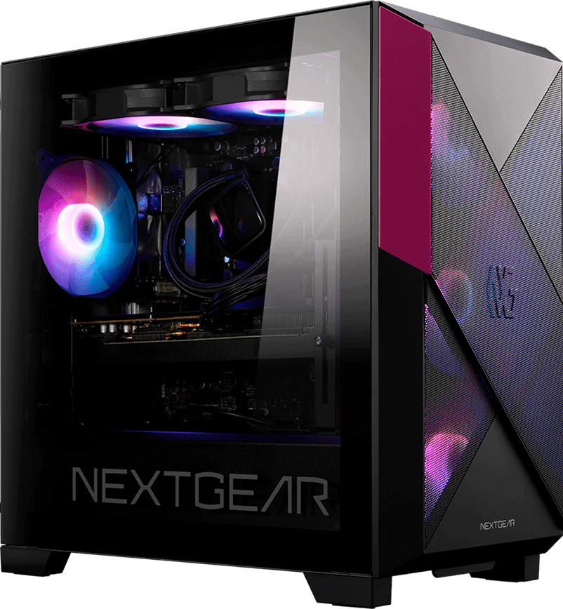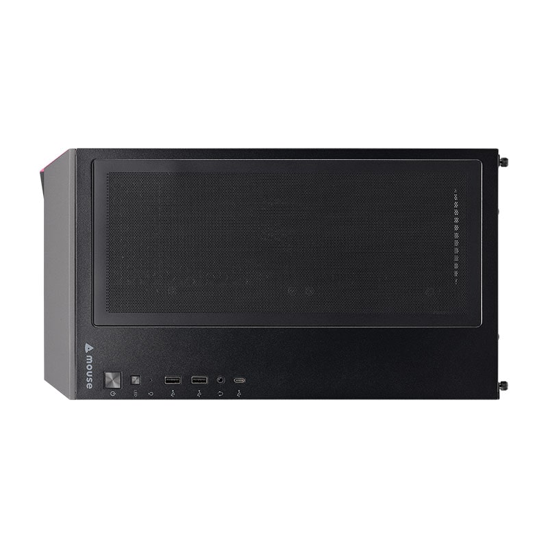 パソコンの中身が見えるガラスパネルを標準で装備しています。正面にはブランドカラーの「スパークマゼンタ」色のロゴがあり、黒いボディのアクセントになっています。LEDファンで光らせれば、自分だけのカッコいい空間を作れます。